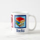Ein niedliches Weihnachtsgeschenk für Bibliothekare mit einem Friedenszeichen, Herz und einem Stapel Romane. Peace Liebe Books ist ein gutes Geschenk für Autoren, Schriftsteller oder Schriftsteller. Hübsche Tasse für einen Lehrer oder einen Buchklubmitglied.
