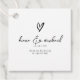 Ein kühner, dekorativer Schriftart erweckt sofort den Eindruck und Set für die meisten Teile dieser modernen, minimalistischen Hochzeitssuite. Die Gastgeschenk Hochzeit-Tag, hier in schwarz auf weiß gezeigt, verfügt über eine Vorlage, um leicht eine persönliche Danksagung, Ihre Namen und Hochzeitsdatum hinzuzufügen. Eine von Hand gezeichnete Herzform vorne und eine Blüte auf der Rückseite verleihen zusätzlichen lustigen Akzenten. Suchen Sie ID940 um alle Produkte in diesem Hochzeitsfest Set zu sehen.