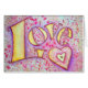 Aquarellmalerei des goldgelben Wortes "Liebe" mit Doppelherz. Rosa und lila beleuchten die Buchstaben und das Herz. Ein leichter Glitzer über die Decke verleiht dem Gemälde ein funkelnd Glühen.