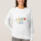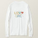 Schreiben Sie eine kurze Beschreibung des T - Shirt-Designs für das Bild von "Liebe, Lachen, Leben".