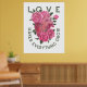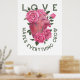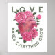 Das Bild zeigt ein herzförmiges Symbol, umgeben von rosa Rosen und Blätter. Das Herz steht im Zentrum des Bildes. Es ist von mehreren rosa Rosen umgeben, die mit grünen Blätter versehen sind, die aus dem Herzen zu wachsen scheinen. Die Rose und Blätter schaffen eine halo-ähnliche Wirkung rund um das Herz und verleihen ihm ein lebendiges und üppiges Aussehen. Der Satz "Liebe lässt alles wachsen" ist in kursiver Schrift unter dem Herzen geschrieben und wird von zwei kleinen rosa Blume gerahmt. Der Gesamteindruck des Bildes ist Liebe, Wärme und Wachstum. Das Bild legt nahe, dass Liebe eine mächtige Kraft ist, die sich ernähren und allen Dingen Leben bringen kann.