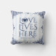 Liebe wohnt hier im Hochzeitskissendesign. Navy Blauer, anpassbarer Text, doppelte Herdbilder, pastellblau-weiße Streifen Hintergrund und eleganter marineblauer Vintager Paisley Rahmen.