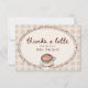 Feiern Sie die zukünftige Braut mit dieser "Love is Brewing Gingham Coffee Bridal Shower"-Dankeskarte. Mit einem Wasserfarben-Latte Macchiato, verziert mit Herz-Schaumkunst, Kaffeebohnen, "Thanks a Latte" in trendiger Schrift-Kalligrafie und einem vintage, gewellten Rahmen vor einem warmen, beige karierten Hintergrund, bringt dieses gemütliche, cafe-inspirierte Design rustikalen Charme in Ihre Hochzeitsdusche-Papeterie. Perfekt zum Ausdruck von Dankbarkeit gegenüber den Gästen, passt diese editierbare Dankeskarte wunderbar zu den darauf abgestimmten "Love is Brewing"-Einladungen und Dekorationen.