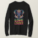 Eine elegante und kraftvolle Darstellung eines Elefanten mit bunten, regenbogenförmigen Mustern und Textilien. Die komplexe Kopfbedeckung und das drapierte Tuch zelebrieren den kulturellen Reichtum und den LGBTQ+-Stolz, während der fette Text "LIEBE LOUDER" darunter eine Botschaft unentschuldigender Zuneigung und Aktivismus untermauert. Dieses Kunstwerk vereint Kraft und Mitgefühl, ermutigt die Zuschauer, mutig zu leben, Liebe frei zu halten und in ihrer Identität groß zu sein.