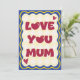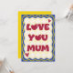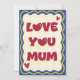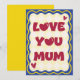 Eine kühne und fröhliche Grußkarte mit der Botschaft „LIEBE MAMA“ in spielerischer roter Schrift, vor einem weichen gemusterten Hintergrund und umrahmt von einer lebendigen blau-gelben dekorativen Umrandung. Kleine Herz-Akzente fügen einen warmen und liebevollen Touch hinzu und machen dieses Design perfekt, um Liebe und Wertschätzung für Mama auszudrücken.
