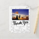 Eine klassische Postkarte mit Dankeschön, geschrieben in einem Skript-Schriftart und durch den Namen des Paares in einem modernen Schriftart betont. Es gibt Platz für dein Lieblings-Hochzeitsfest-Foto. Liebe ist ein niedliches Wortkunstmuster in hellgrau. Die Rückseite hat Platz für eine handschriftliche Notiz.