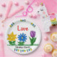 Hübsche Blume in goldgelb, blau-gelb-matschig und lila Tulpe blühen im Gartengras. Sommerliche lustige bunte Folk Art Feeling. Liebe Mother Earth ist in roter und schwarzer Typografie geschrieben. Original Artwork Design von TamiraZDesign.