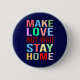 Ein farbiger Text Make Liebe Not War Bleibe Zuhause vor dem schwarzen oder dunklen Hintergrund. Ein lustiger Knopf für jeden. Sie können dieses Design auf ein anderes Produkt übertragen. Viel Spaß, kaufe einen, genieße, bleibe sicher und sei glücklich!