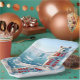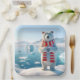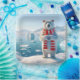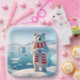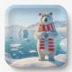 Ein Eisbär mit einem rot-weiß gestreiften Schal steht auf einer eisigen Landschaft und hält seine Pfoten in Herzform