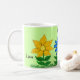 Hübscher Blumengarten mit goldgelber Blume, blau-gelber Blume und lila Tulpe im grünen Gras. Liebe ist in schwarzem Skript um hellgrüne Tasse geschrieben. Hübsche Tasse, um jemandem den Tag aufzuheitern. Original Grafik von TamiraZDesign. www.zazzle.com/tamirazdesigns