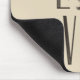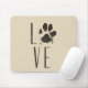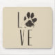 Ein Mousepad mit einer niedlichen Abbildung eines gezeichneten Hundepapads in Braun mit Grunge-Stil. In den Buchstaben wird das Wort "Liebe" mit dem Pfotendruck anstelle des Buchstabens "o" beschrieben. Phantastisch für Liebhaber von Haustieren.