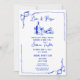 Einzigartiger Kobaltblauer Handgezeichneter Zeitgenössischer Retro Französischer Spaß Einladung mit einem Bugrahmen, ein skurriles trendiges Kunstwerk für Ihre französische Hochzeit von Savanamm und "Liebe und Pizza" Text