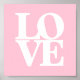 Einfache Liebe in weißer Schrift auf einem rosafarbenen Kunstposter, ideal für ein Kinderzimmer für Mädchen, ein Kinderzimmer oder ein Spielzimmer. Liebe rosa Plakatdruck ideal für ein Kind, das geliebt wird. Design von Sarah Trett.