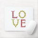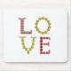 Das Wort LIEBE, hergestellt mit Bildern von Rubien und Gelben Saphir Edelsteinen in Herzform, Birnenform, Oval, Rundform und rechteckige Form.