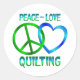 Quilters können ihre Gefühle mit diesem lustigen Retro-Design mit einem Friedenszeichen, Herz und die Worte - Peace Liebe Quilting.
