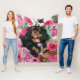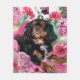 Schwarz-Bein-Cavalier-King-Charles-Spaniel-Vlies-Decke. Blauer Hintergrund, mit rosa Blume, Rose, Nelken.