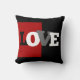 LIEBE Kissen (schwarz, weiß, grau und krümelrot). Fett Buchstaben LIEBE Pop auf einem Hintergrund von schwarz und crimson.