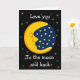 Gelber Mond schlafend in einem blauen Nachthimmel mit kleinen gelben Sternen. Der Hintergrund ist schwarz, mit farbigen Sternen, die um sich herum verstreut sind. Oben und unterhalb des Mondes stehen die Worte "Liebe zum Mond und zurück" in weißer Schrift. Im Inneren der Karte befindet sich eine Vorlage in weißem Text, um Ihre eigene Nachricht hinzuzufügen.