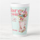 Personalisierte latte Tasse mit "Liebe du a latte" geschrieben. Niedliches Design mit Retro-Polka-Punktmuster und Darstellung einer latten Tasse mit Erdbeeren und Creme, Makaronen, Donuts und süßen Leckereien.