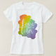 Dieser T - Shirt enthält ein inspirierendes Zitat in einem handgeschriebenen Skript, in dem steht: "Liebe sieht keine Farbe" vor einem Hintergrund mit Regenbogenfarben.