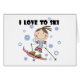 Mädchen, die die Liebe, die und auch Liebe-Strichmännchen Ski fährt, erhält einem Tritt aus unserer Liebe heraus, Ski zu fahren T - Shirts, Hoodies, Tassen, Karten, Aufkleber, Taschentaschen, Schlüsselanhänger und anderes Skikleid und -geschenke, die ein Strichmännchenmädchen und -text, der, kennzeichnen "mich Liebe Ski zu fahren!" liest.