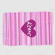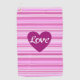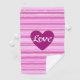 Liebe in handgeschriebenem Skript im Weiß auf einem Pflaumenfarbherzen auf Rosa, Weiß und Pflaume färben Streifen.