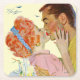 Künstler: Bernard D'Andrea | Rothaarige Dame küsst den Mann hinter Sonnenblumen mit einem blauen Stuhl und einer Katze.