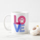 L O V E Zauber LIEBE Tasse. Das "O" in der Liebe ist ein Pfotendruck im Inneren. Die Buchstaben LIEBE sind in Rosa und lila gehalten. Zeigen Sie Ihre Liebe von vier Beinfreunden, während Sie auf Ihrem Lieblingsgetränk schlürfen.