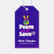 Funky cool danke Ihnen Geschenke Tags mit Frieden und Liebe geschrieben in einem groovy Typografie-Schriftart. Die Illustration ist ein handförmiges Friedenssymbol, die Finger in der klassischen v-Zeichen alle in Regenbogenfarben. Ein kleines doodle Herz neben dem Wort Liebe. Psychedelisches Groovy Design. Säurefreier lila Hintergrund. Personalisieren Sie Ihre Daten mit Ihren Namen oder anderen Texten.