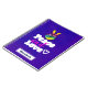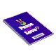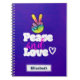 Ein funky cooles personalisiertes Spiralnotebook mit Liebe und Ruhe in einem großartigen typografischen Schriftart. Die Illustration ist ein handförmiges Friedenssymbol, die Finger in der klassischen v-Zeichen alle in Regenbogenfarben. Ein kleines doodle Herz neben dem Wort Liebe. Psychedelisches Groovy Design. Säurefreier lila Hintergrund.