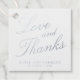 Elegante typografische Gastgeschenk Hochzeit Tag mit einem einfachen Design mit den Worten "Liebe und Dank" in einem Skript-Schriftart, und Ihre Namen und Datum unten, in einem Serif-Schriftart. Alle Designelemente sind in echter Silberfolie auf weißem Hintergrund. Diese stilvollen und schicken Tags sind ein guter Weg, um Ihren Favoriten eine klassische Touch hinzuzufügen.