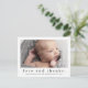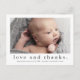 Eine süße Foto-Geburtsankündigung und Dankeschön-Karte mit einem einfachen modernen Typ und Single-Foto auf der Vorderseite. Der Rücken ist eine Postkarte mit einem großen Titel und einer persönlichen Nachricht aus der Familie. Klicken Sie auf die Schaltfläche Bearbeiten, um dieses Design mit Ihren Fotos und Details anzupassen.