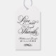 Elegante Cardstock Gevor Tags enthalten "Liebe und Dank" in Skripten mit einer benutzerdefinierten Hochzeitsmonogramm der Braut und Bräutigams verheirateten Namen und Scroll Design Akzent. Schwarzer Text auf weißer Hintergrundfarbe - der an Ihre Hochzeitsfarbe angepasst werden kann.