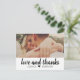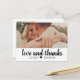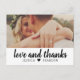 Stilvolle Hochzeit danke Ihnen Post-Card-Vorlage zeigt "Liebe und Dank" in einem rustikalen chic handgeschriebenen Skript-Schriftart mit individuellem Monogramm und einem Landschaft-Foto (1 x 2 Verhältnis) der Braut und Bräutigam auf der Vorderseite, und kleineren quadratischen Foto mit individuellem Text, der auf der Rückseite personalisiert werden kann. Klassische Schwarz-Weiß-Farbschemata können komplett angepasst werden.