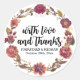 Schöner Herbstkranz aus tiefroten, rosa und orangefarbenen Blume mit zarten Blätter. Mit Liebe und Glück ist in einem großen dekorativen handgeschriebenen Schriftart geschrieben. Die Namen der Braut und des Bräutigams und ihr Hochzeitstermin sind unten aufgeführt. Diese werden auf Gastgeschenk Hochzeiten Taschen, Hochzeitskisten und Dankeschön-Notizen schön aussehen.