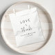 Elegante weiße Gunsttaschen für Ihre Hochzeitsgäste mit "Liebe + Dank" in schlichter moderner Typografie und einem stilvollen Drehbuch mit Wimpern, Ihren Vornamen verbunden durch ein Herz und Ihr Hochzeitsdatum.