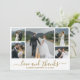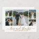 Modernes, elegantes Script Wedding 5 Foto Collage Danke Karte in Gold und Weiß. Minimalistische, stilvolle Hochzeitskartenvorlage mit fünf (5) Grid-Foto-Collage auf der Vorderseite und einem "Liebe and Dankeschön"-Kalligrafieschreiben in einem handgeschriebenen Swash-Schwanz-Schriftart. Personalisieren Sie Ihren Namen und danken Sie Ihnen Nachricht. Wenn Sie Hilfe oder Matching Artikel benötigen, wenden Sie sich bitte an Designer!