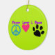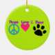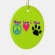 Niedliche Grafik in bunten Neonfarben. 3 Symbole - ein Friedenszeichen, ein Herz und eine Pfote, mit den Worten Frieden, Liebe und Pfoten. Für ruhige Haustierbesitzer.