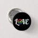 Liebe und Frieden unterzeichnen herein Regenbogenfarben. Hippie-Retro Regenbogensteigungs-Friedenssymbol-Grafikbild. Frieden und Liebe sind ganz um uns, Sie müssen nur schauen. Groovy 70erart-Popkunst Hippy-Liebe. Button es mit grellen Artknöpfen! Suchen Sie diesem und nach mehr in unseren Knöpfen für Flair-Sammlung!