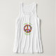 Das Panzeroberteil der Damen ist mit einem Blumenschild in Rosa, Gelb, Orange, lila, Grün, Weiß, Schwarz und Türkis versehen. "Frieden, Liebe und Glück" umgeben das Friedenszeichen.