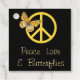 Grosses gelbes Friedenssymbol, das auf der ganzen Welt erkannt wird, mit gelbem Schmetterlingsüberlagerungen auf schwarzem Hintergrund. "Peace Liebe & butterflies" ist anpassbar