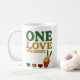 Tasse der jamaikanisch inspirierten Liebe, die Frieden und Liebe für alle zum Ausdruck bringt. "Eine Liebe" ist ein Satz, der die Vorstellung von universeller Liebe, Einheit und Harmonie unter allen Menschen verkörpert, unabhängig von Unterschieden oder Spaltungen.