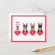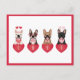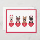 Illustration von drei französischen Bulldohhundewelpen verschiedener Farben, die im Valentinstag-Kleid aus den Herzen springen.