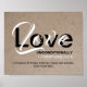 Stilvolles rustikales Aussehen inspirierendes Christliches Plakat basierend auf 1 Korinther 13:7-8. Text liest LIEBE UNBEDINGT in Schwarz-Weiß-Typografie. Die Schriftzeichen sind vollständig geschrieben, aber dieser Text ist KUNSTBAR, sodass Sie die Bibelübersetzung in Ihre Lieblingsversion ändern können.