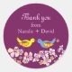 Whimsikale, niedlich küssende Vögel und Blume mit einem pflaumenfarbenen Hintergrund, entworfen auf maßgeschneiderte Hochzeit Dankeschön Stickers. ((Sie finden die passenden Hochzeitsessentials & Favoriten in diesem Laden, Bridal Heaven. Wenden Sie sich an ujean4791@gmail.com, um sich mit der Arbeit und/oder der Koordinierung von Hochzeitsaufträgen zu befassen.)