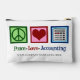 Kosmetiktüte für niedliche Buchhalterin oder Zubehör mit eigenem Firmennamen. Dieses Geschenk enthält ein Friedenszeichen, ein Herz und einen Taschenrechner. Peace Liebe Accounting für ein CPA.