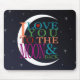 Farbenfrohe Formulierung: "Liebe dich zum Mond und zurück" mit den Nachtstars und Himmel hinter einem teilweisen Mond. Entworfen von Simply Put von Robin; bestimmte Elemente durch Mitgliedschaft bei Graphics Factory