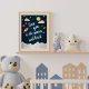 Die attraktive Wandkunst für den kleinen Abenteurer-Raum enthält das Zitat "Liebe zum Mond und zurück" auf einem marineblau-Hintergrund mit Sternen, Monden, Planeten, Wolken und einem Raketenschiff.