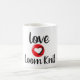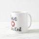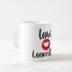Tasse, wenn Sie sitzen und Loom Knitting. "Liebe 2 Loom Strick" große schwarz-rote Buchstaben mit Herz und Zahl 2