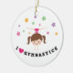 Niedliche Verzierung für die Gymnasts, die ein glückliches kleines Cartoonmädchen mit dem braunen Haar tut einen Handstand und Seitenspalten kennzeichnen. Um sie sind rosa, lila, grüne und gelbe Sterne und sind unten der Text "ich Liebegymnastik" wo die Wort-Liebe durch ein Herz des heißen Rosas ersetzt wird.
